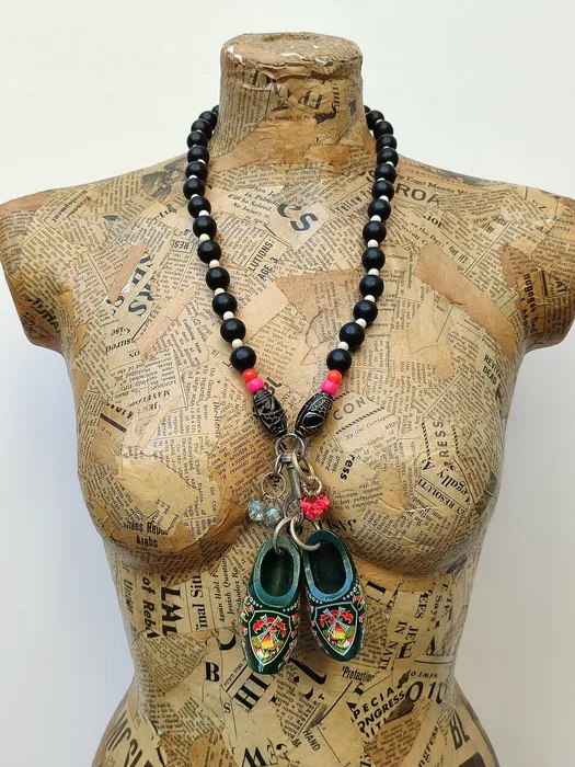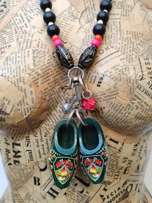 חרוזי עץ ופלסטיק בשילוב כפכפי עץ הולנדים